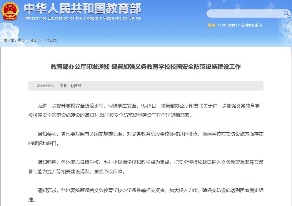 2019年9月2日,国务院教育督导委员会办公室发出《关于进一步加强中小学(幼儿园)安全工作的紧急通知》!各地教育部门要严格按照学校安全防范工作规范要求,为中小学和幼儿园配齐安保人员及必要的安全防护装备器械,严格落实门卫值守、内部巡查等制度,严防无关人员和危险物品进入校园。门卫不能成为摆设,不合格、不发挥作用的要坚决清理、更换。要大力推进一键式紧急报警、视频监控系统与属地公安机关联网工作,确保实现一键报警,及时联动处置。